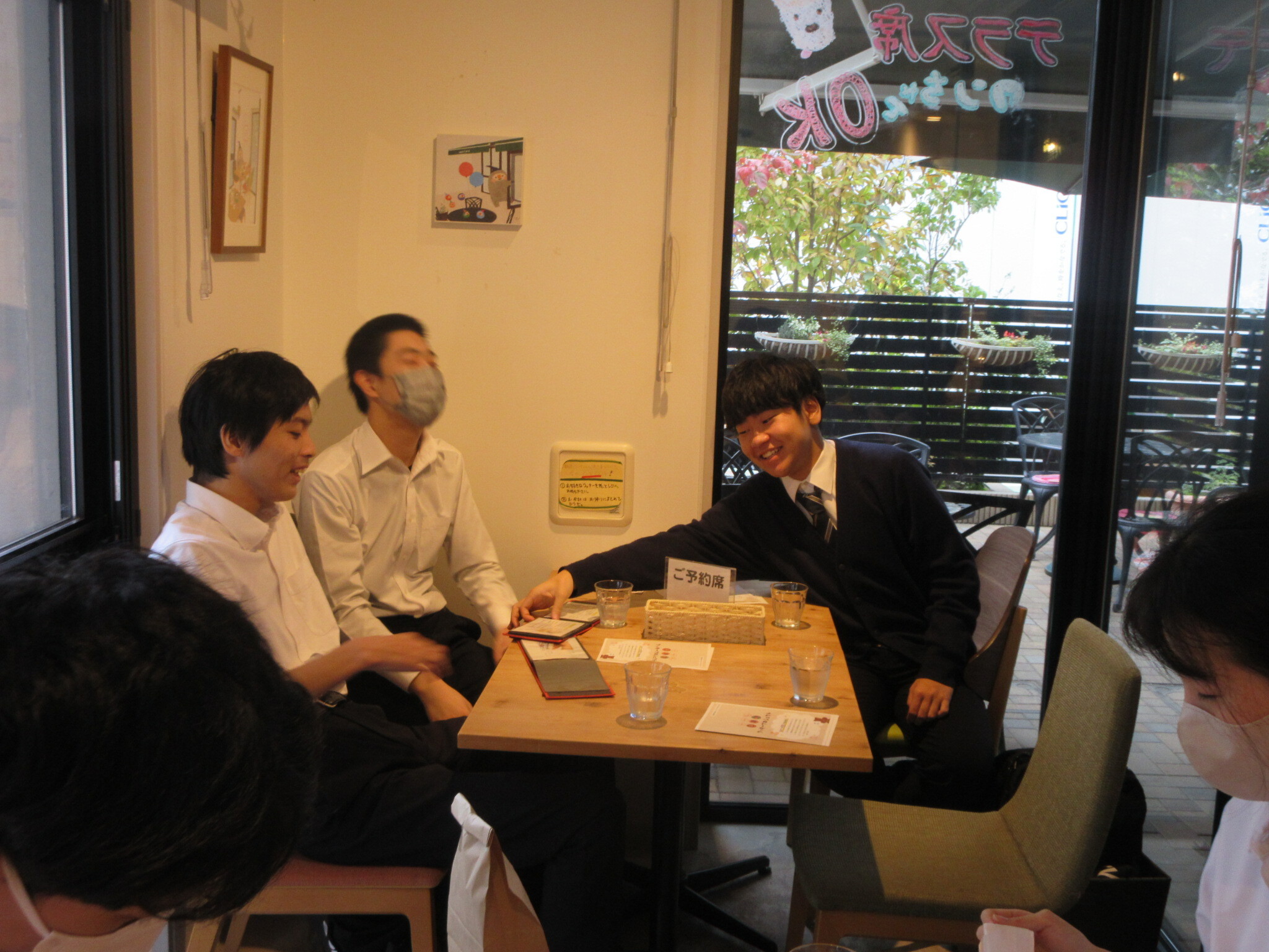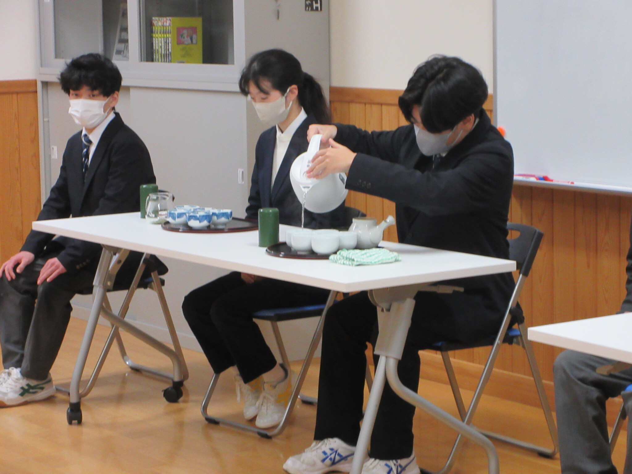 先輩たちに点ててもらったお茶を一口飲んだ後に1年生から「美味しい」と声が漏れていました。2年生の「おもてなし」の心がきっと伝わったことと思います。また、レクリエーション(爆弾ゲーム)などを通して交流を深めることができました。