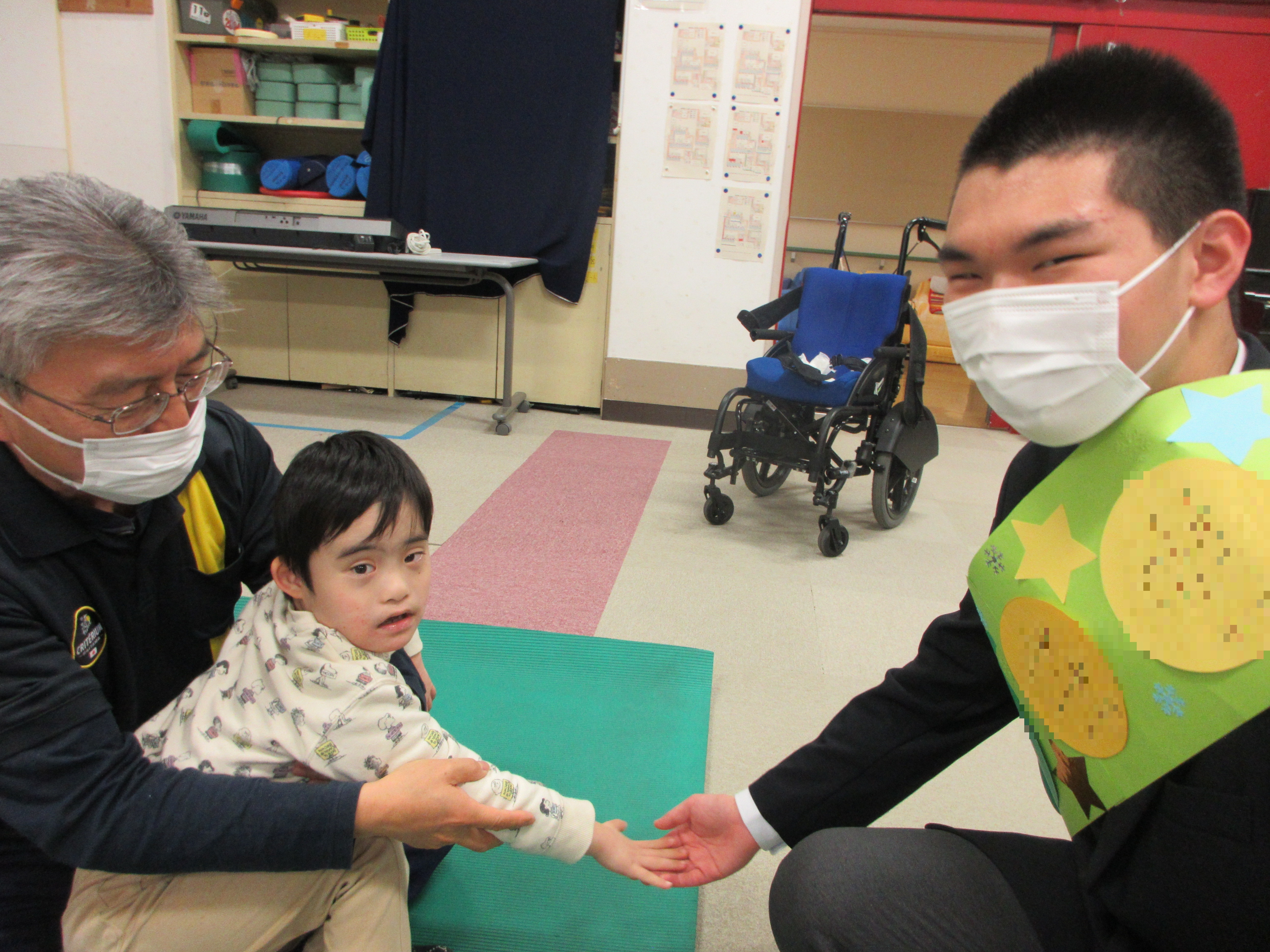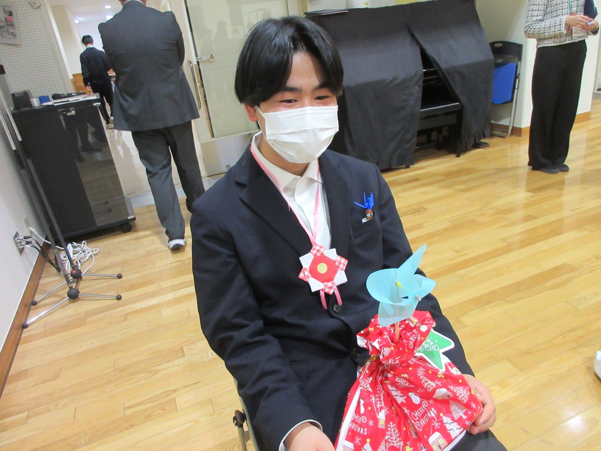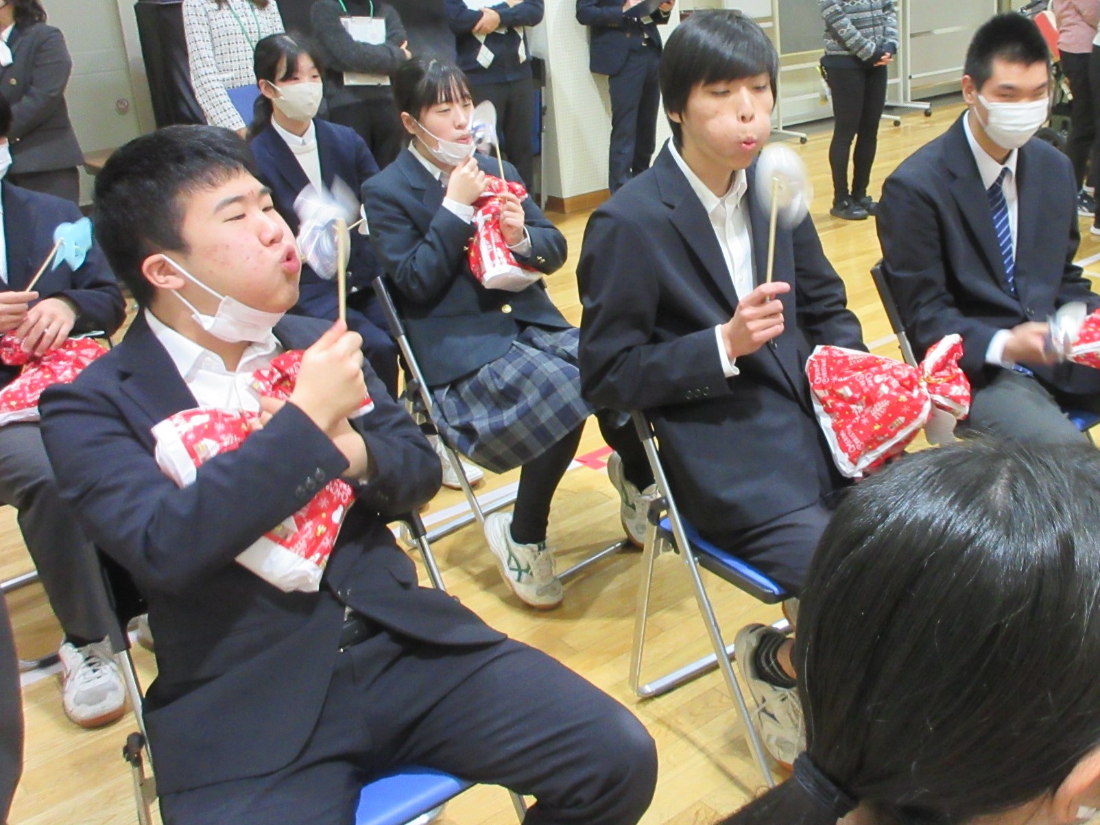 12月23日にクリスマス会をしました。地域の方が来てくださり、お菓子袋・風車・ストラップ等をいただきました。その場で風車を回す生徒の様子も見られ、楽しい会となりました。