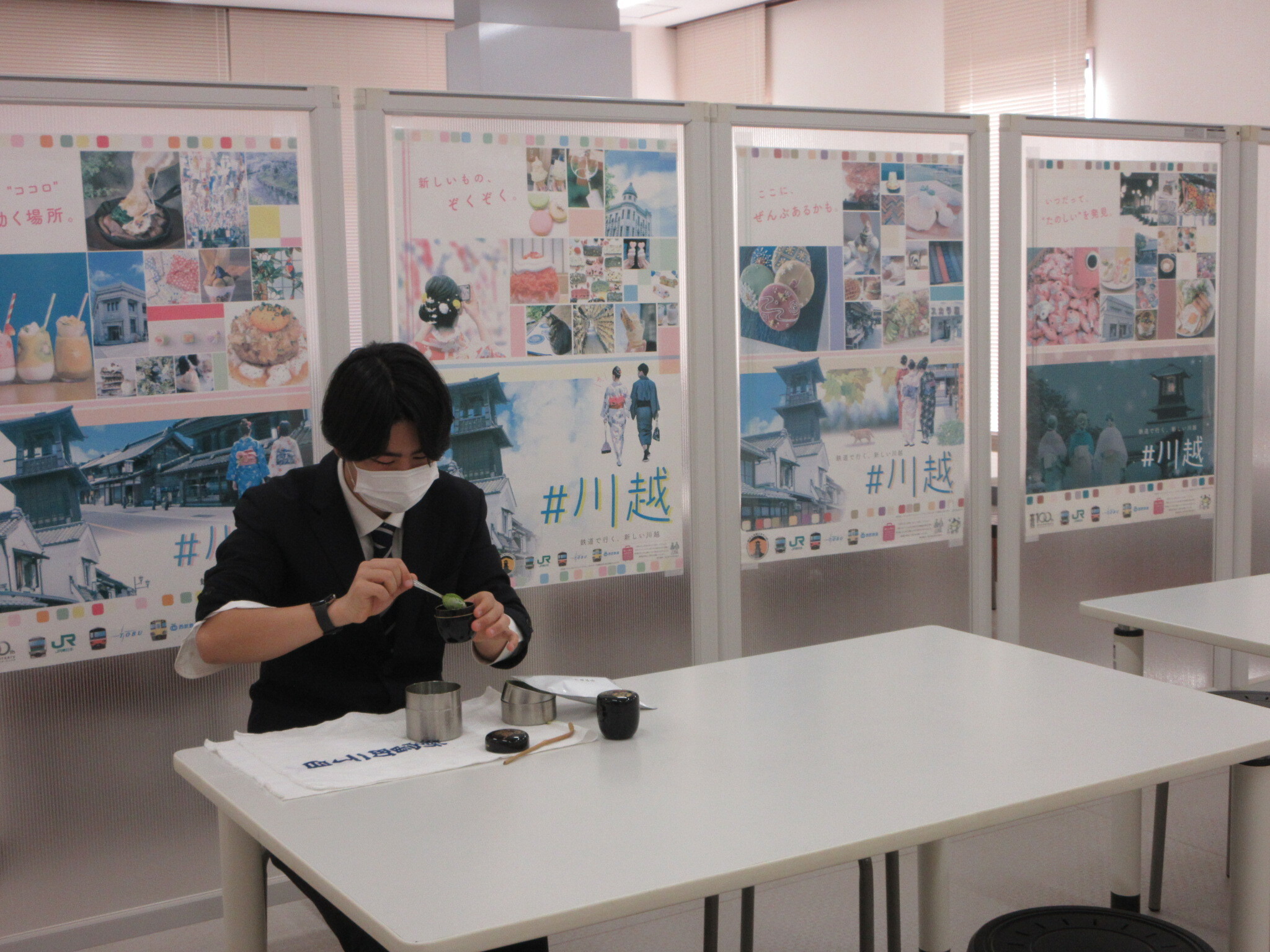 川越宿泊学習の1日目、川越の丹徳庭園に行き、和三盆作り体験や茶道体験をしました。和三盆作りは、みんな初めてで真剣に説明を聞いていました。その後、自分で作った和三盆と一緒に抹茶をいただきました。川越の街並みを散策し、班別行動をしました。2つの班に分かれてみんな食べたいものを食べることができました。