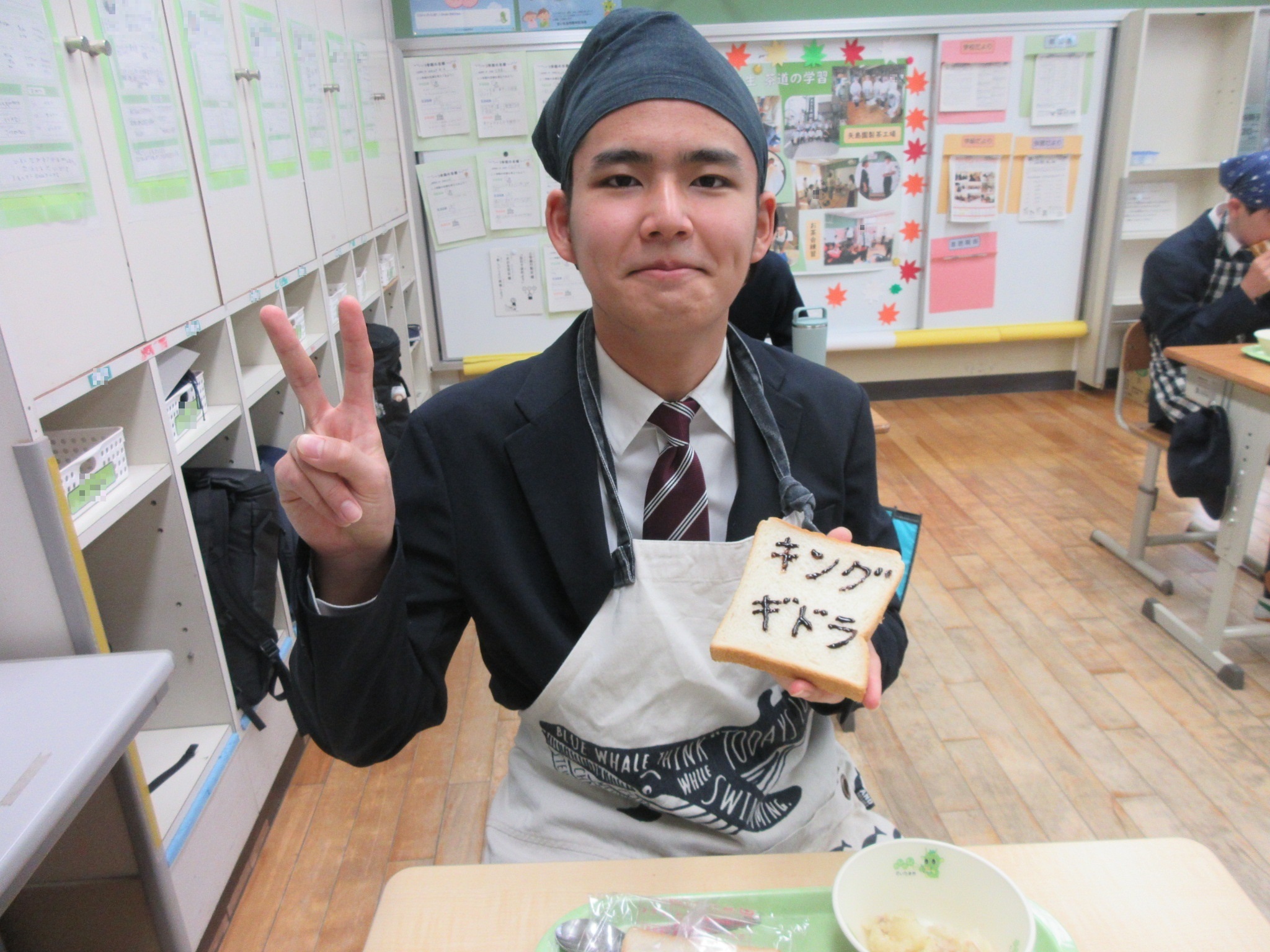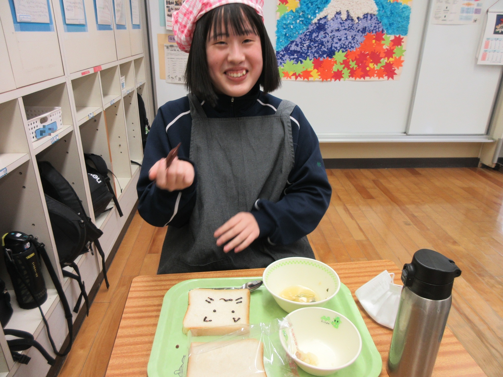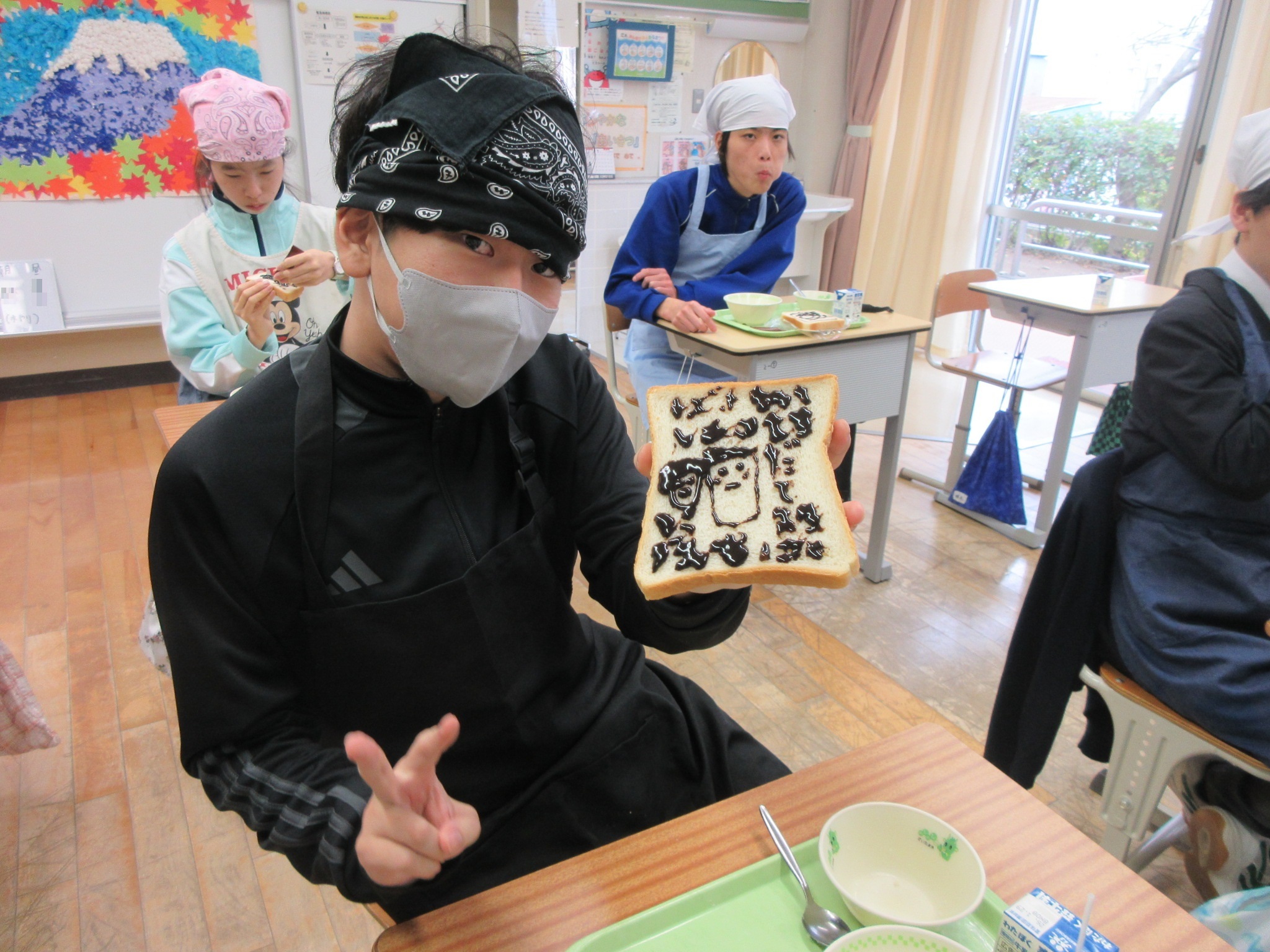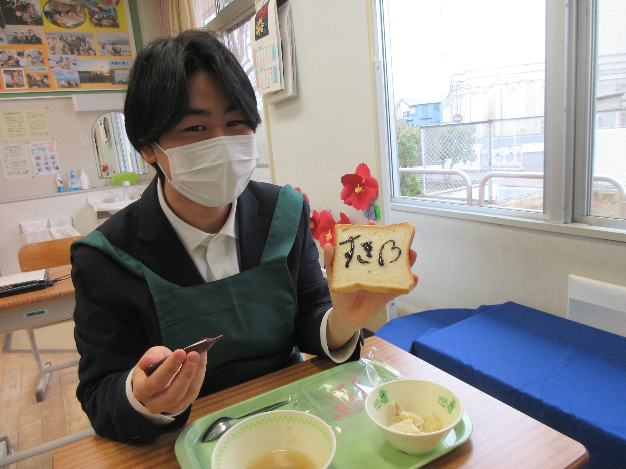 1月20日の給食にチョコペンが出ました。食パンにチョコペンを使ってそれぞれ好きなことを書きました。みんなクラスで好きな絵や文字を書いて楽しみながら食べることができました。