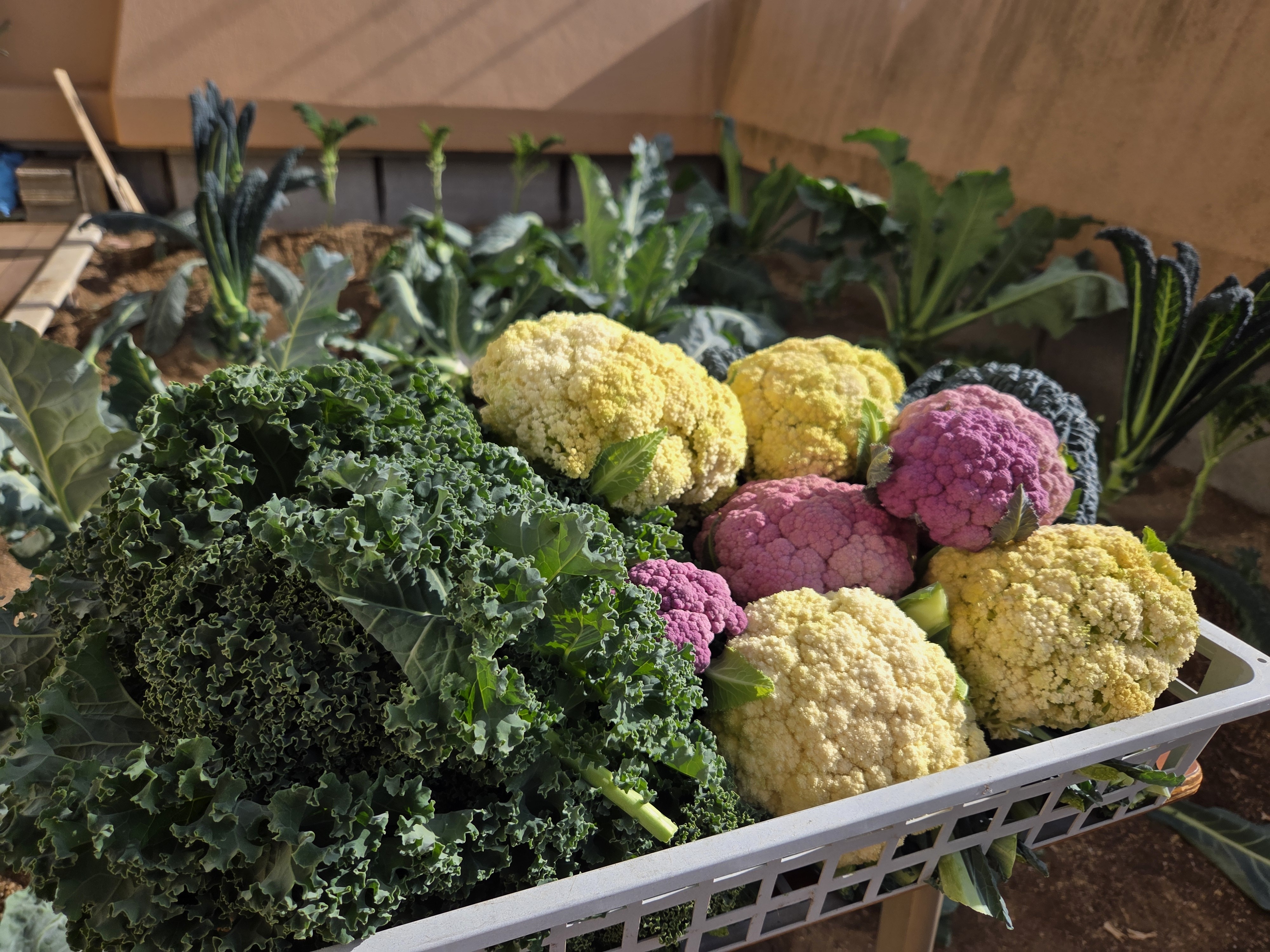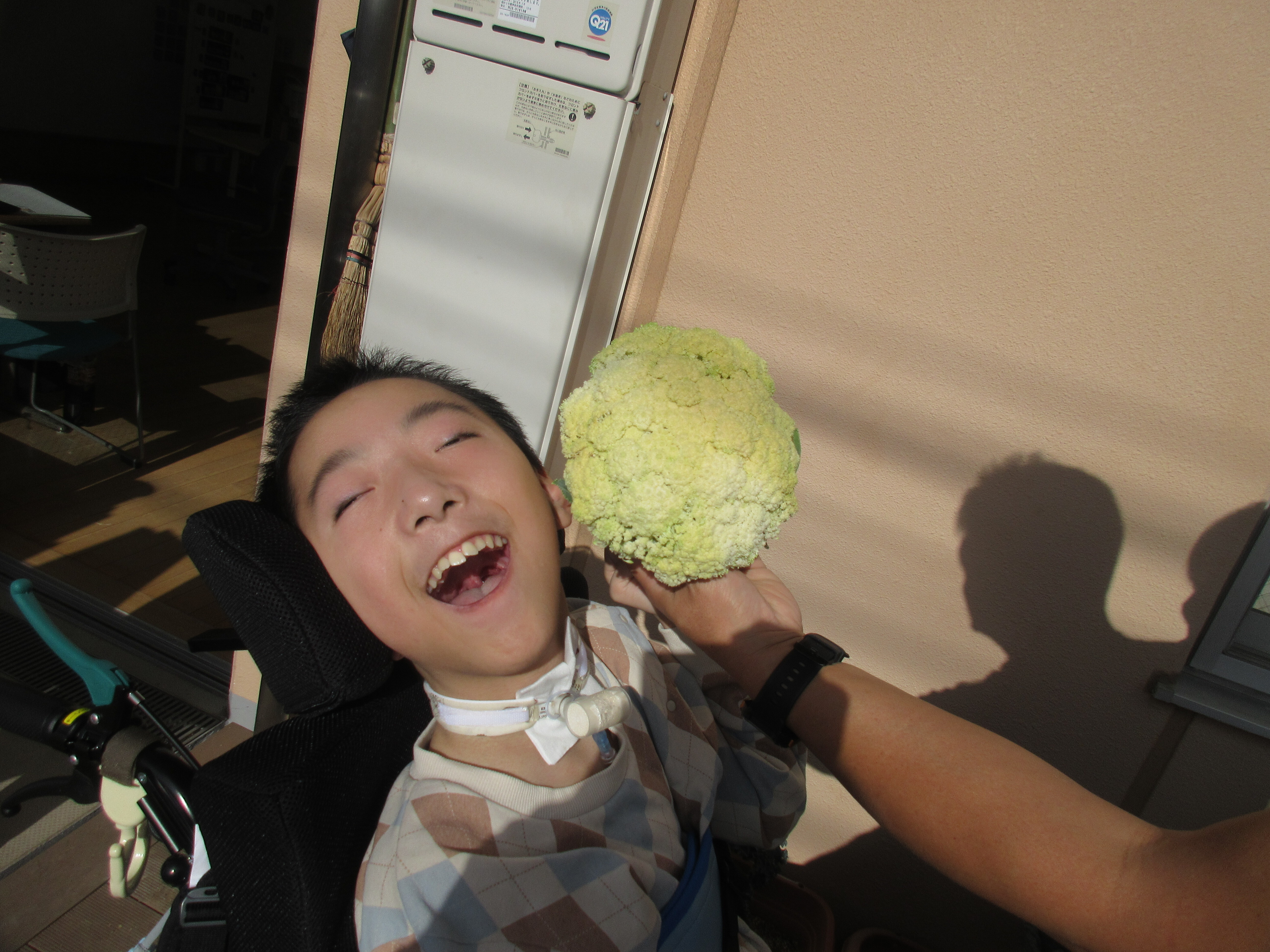 12月…いよいよ収穫です。今年は、天気や気温の関係で上手に育たなかったところもあったようですが、中学部教室前の畑は大豊作でした☆みんなで収穫したカリーノケール、カーボロネロ、紫と白のカリフローレは給食センターに送られ、翌日の給食の「花野菜のサラダ」に入りました。自分たちで育てた野菜はとても美味しかったです。収穫の後に、畑の片づけをして畑納めとなりました。来年もぜひ取り組みたいと思います。