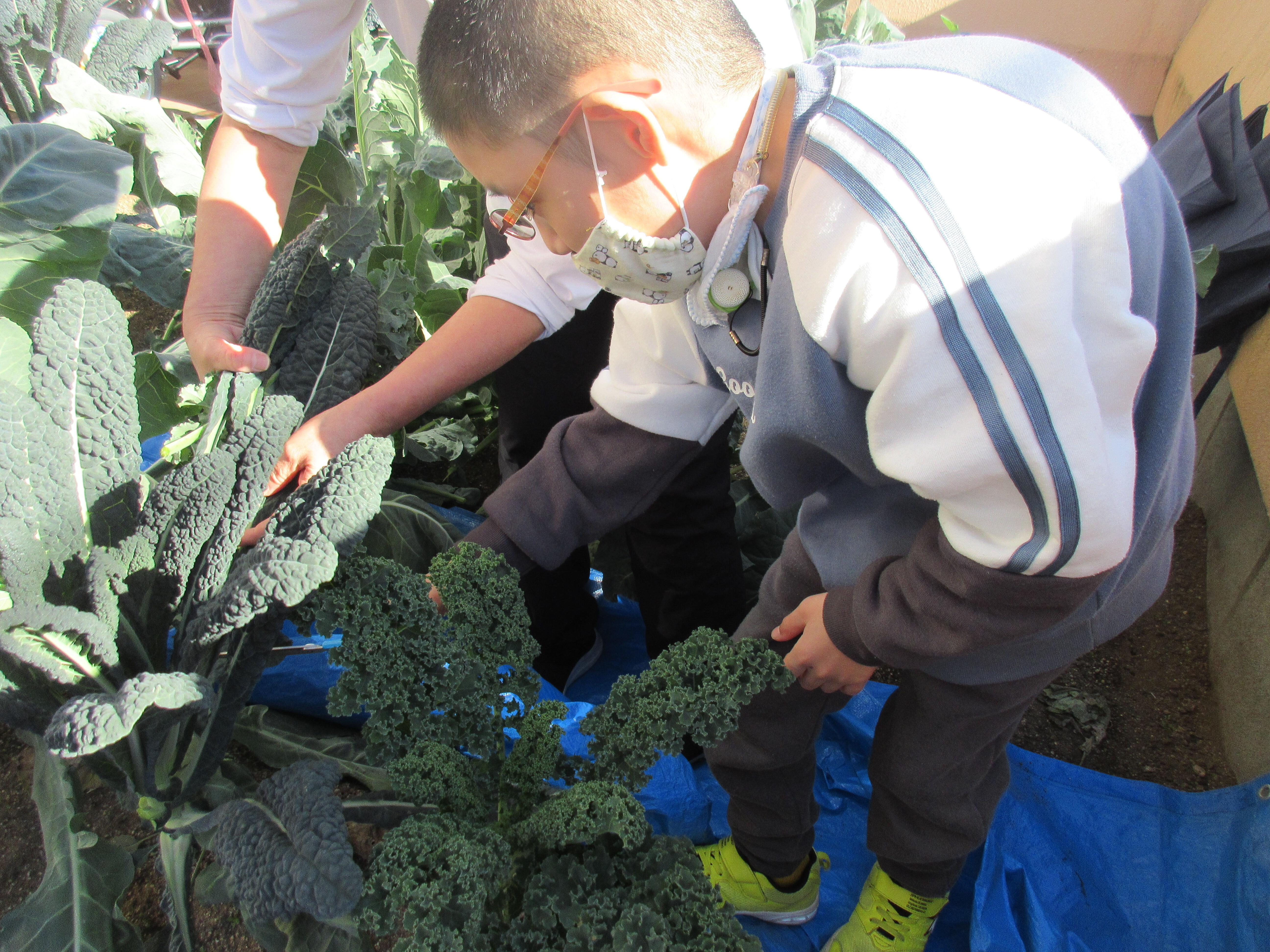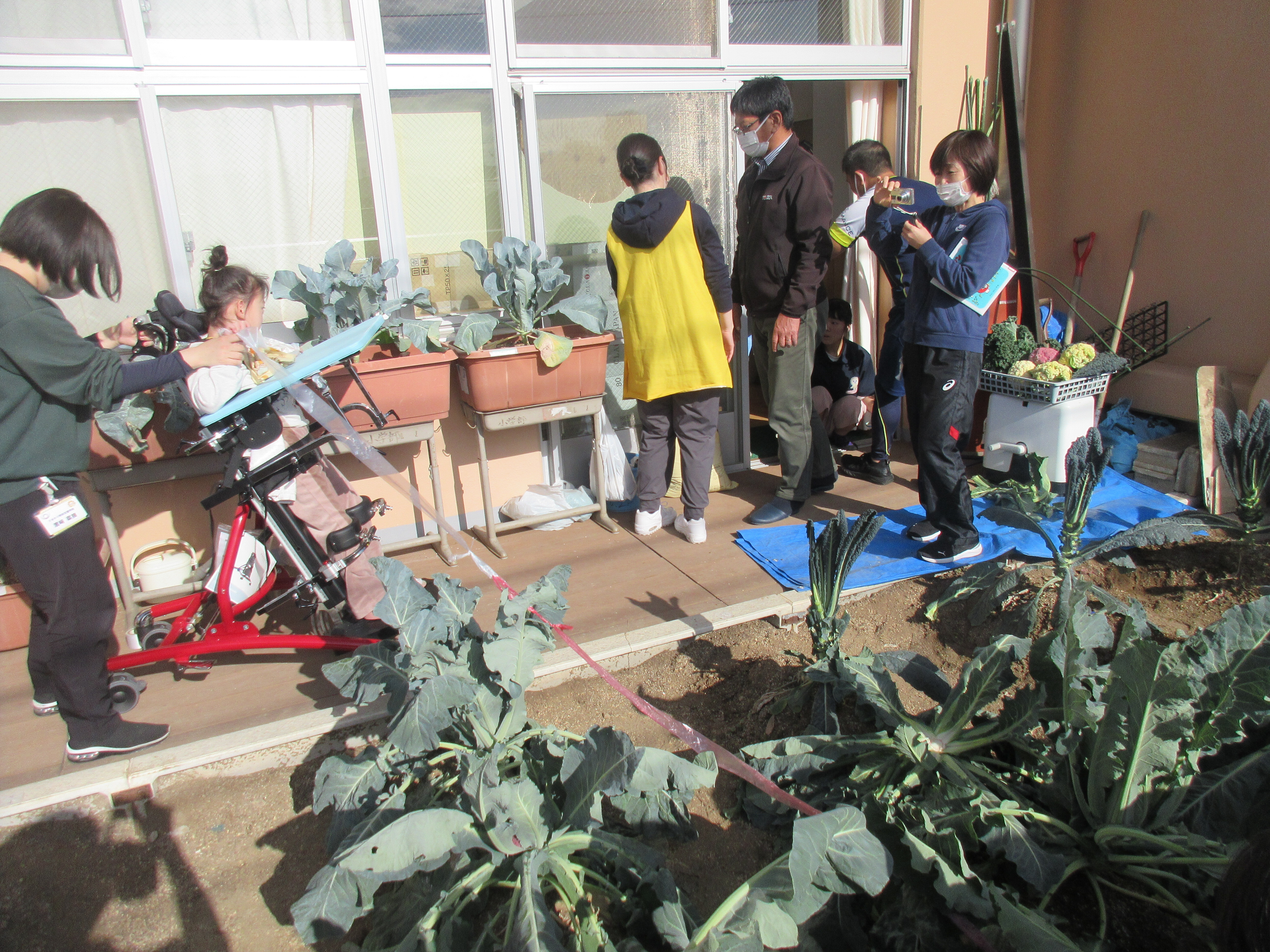 11月…苗屋さんのご指導のもと、ヨーロッパ野菜について学び、さらに大きく育つようにネットを外し、太陽の光のエネルギーをもらえるようにしました。生活単元学習の野菜の観察では、野菜の状態を確認したり、野菜を食べてしまう虫を見つけたりしました。