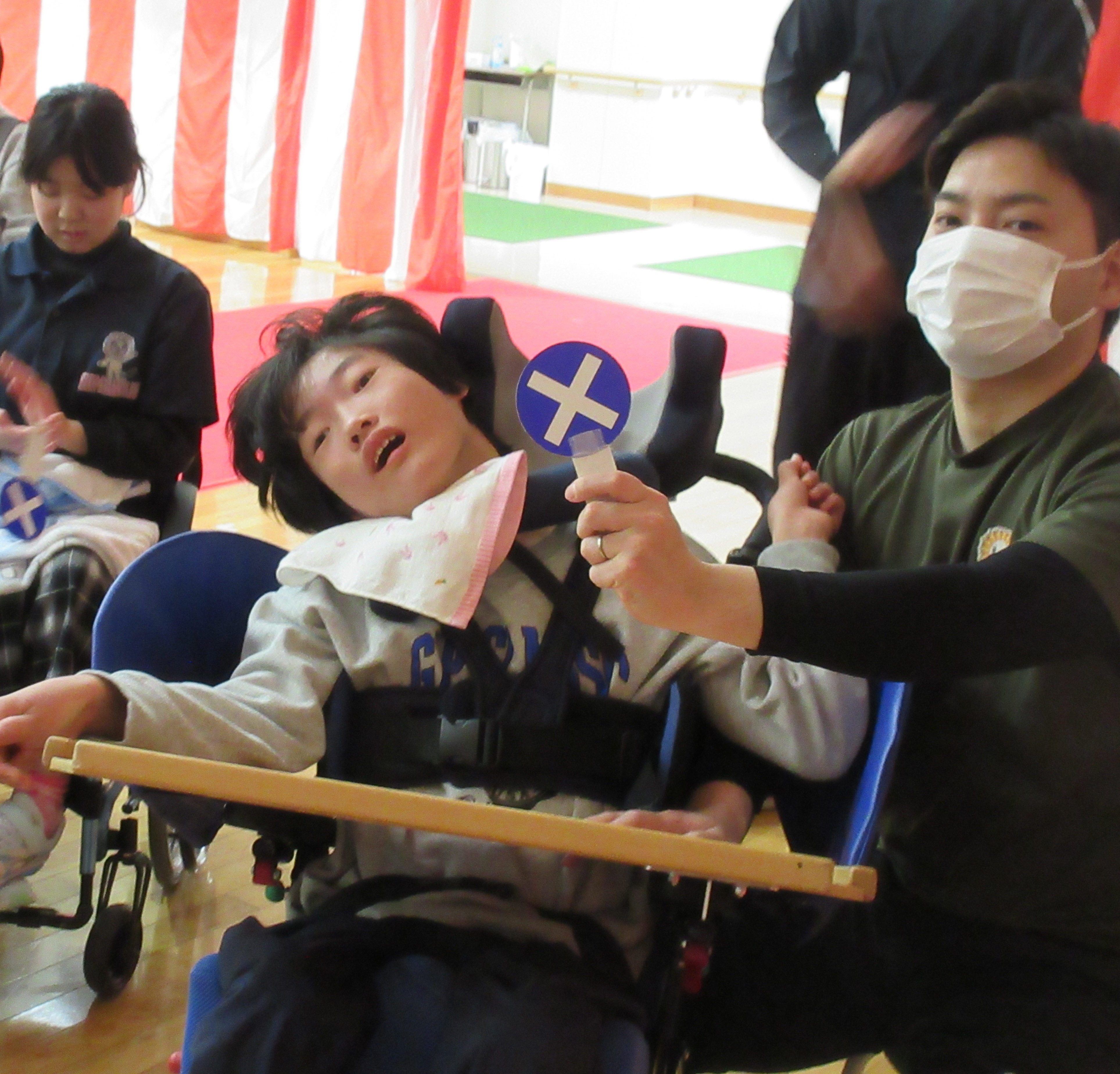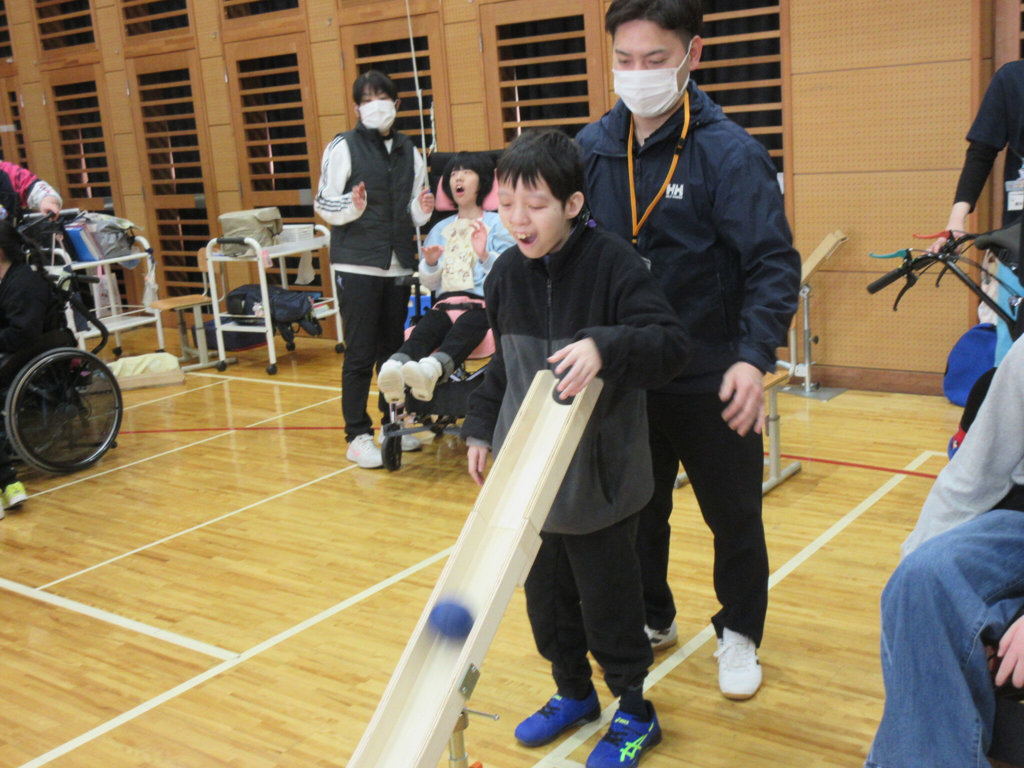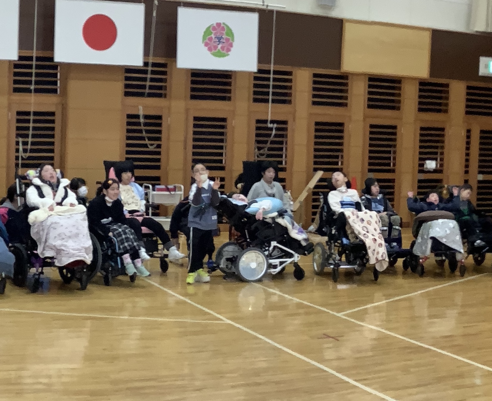 1組目は自力投球の2人と訪問学級2人。たくさん球が入って盛り上がりました!2組目は投球機を使う4名。白組が奮闘し、1対1の同点に。勝負は3組目の副団長を含む3年生4名に委ねられました。結果は白組の勝利。勝っても負けてもかっこいい中学部のみなさんでした。