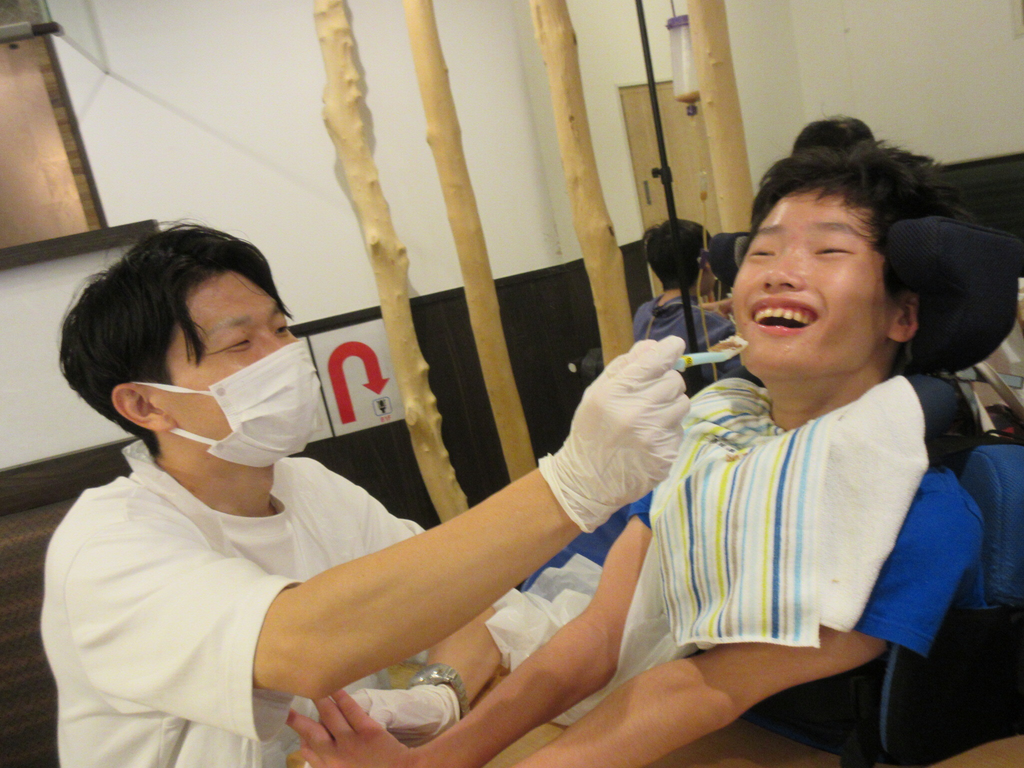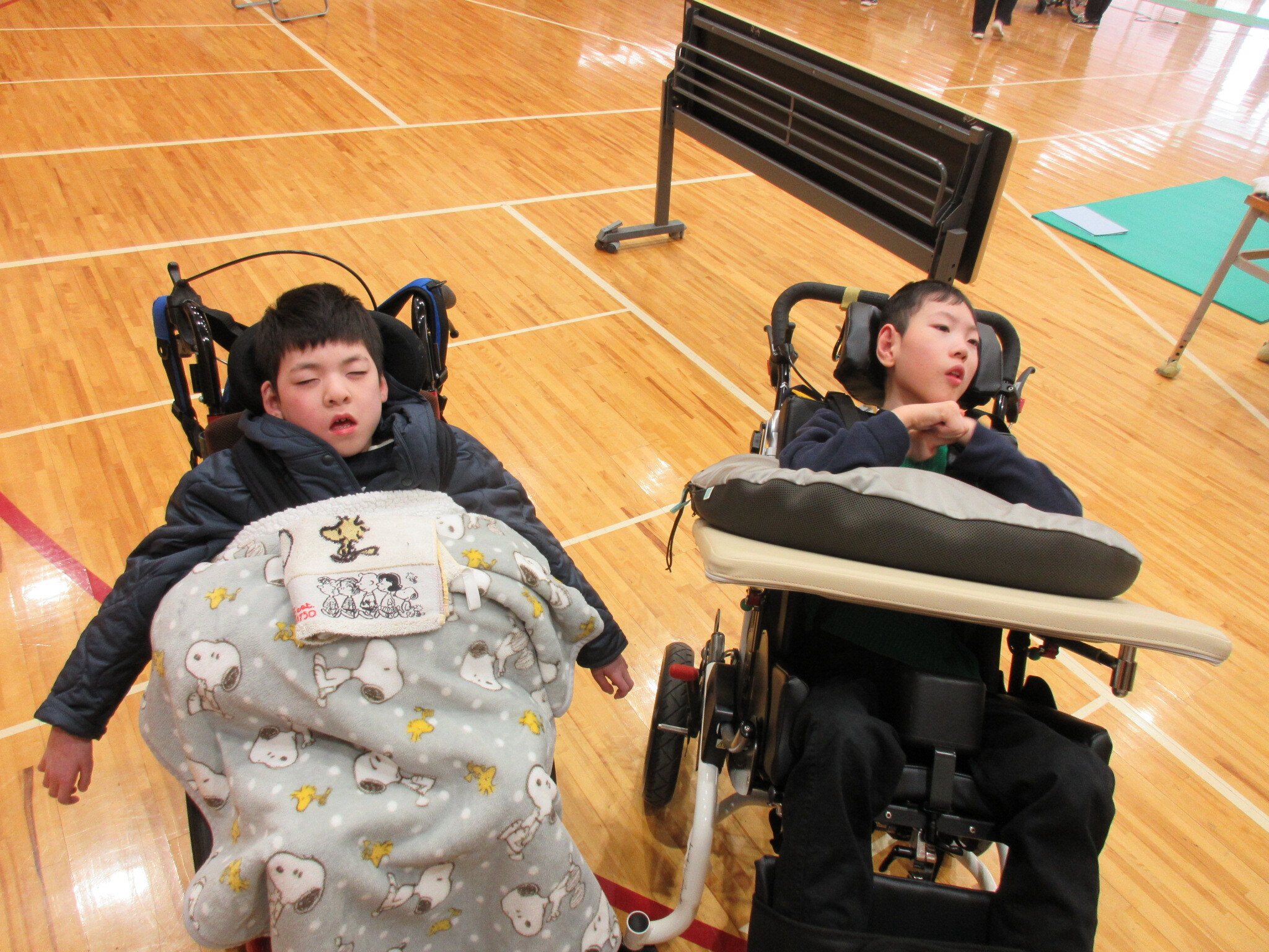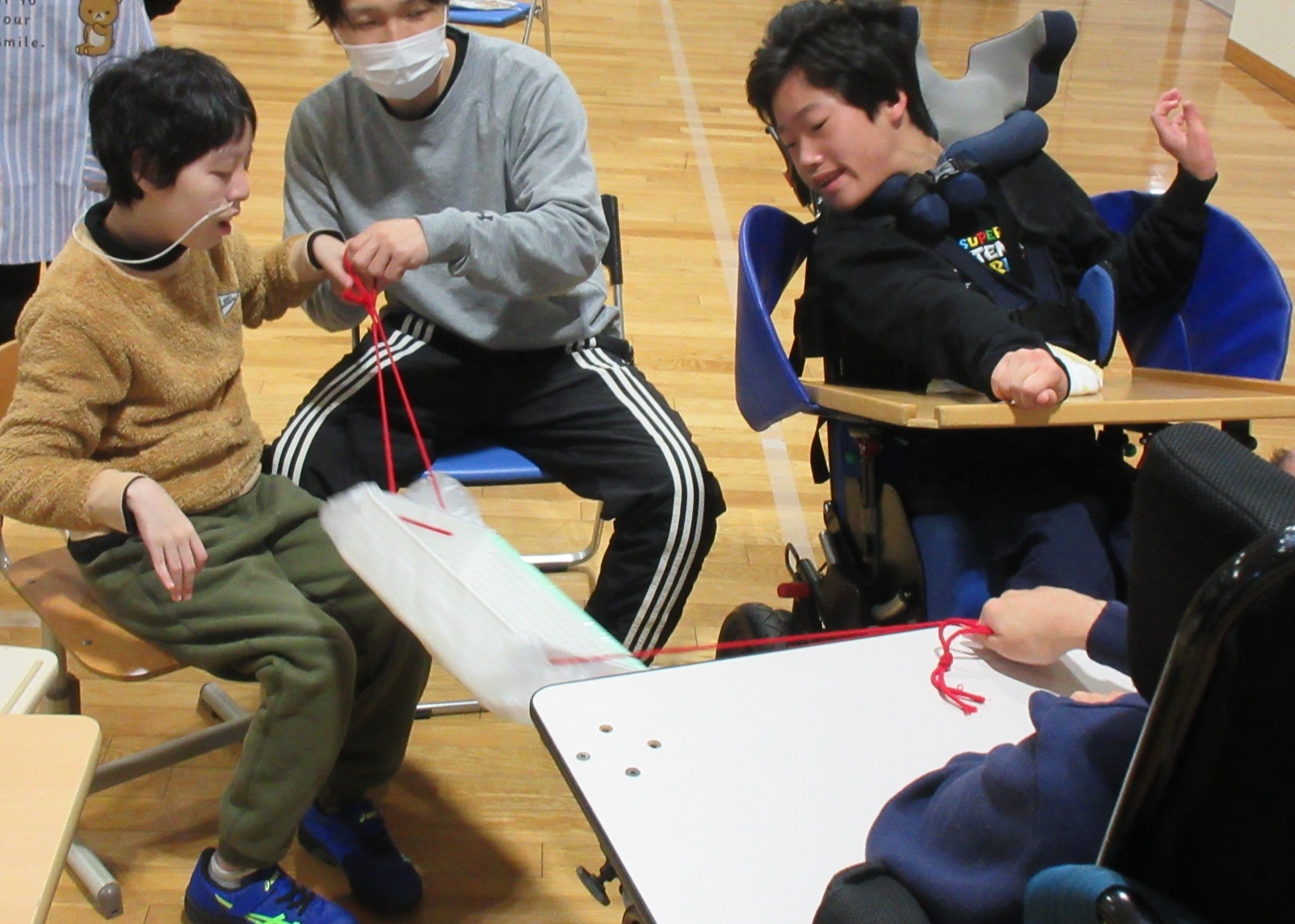 1組目は自力投球の2人と訪問学級2人。たくさん球が入って盛り上がりました!2組目は投球機を使う4名。白組が奮闘し、1対1の同点に。勝負は3組目の副団長を含む3年生4名に委ねられました。結果は白組の勝利。勝っても負けてもかっこいい中学部のみなさんでした。