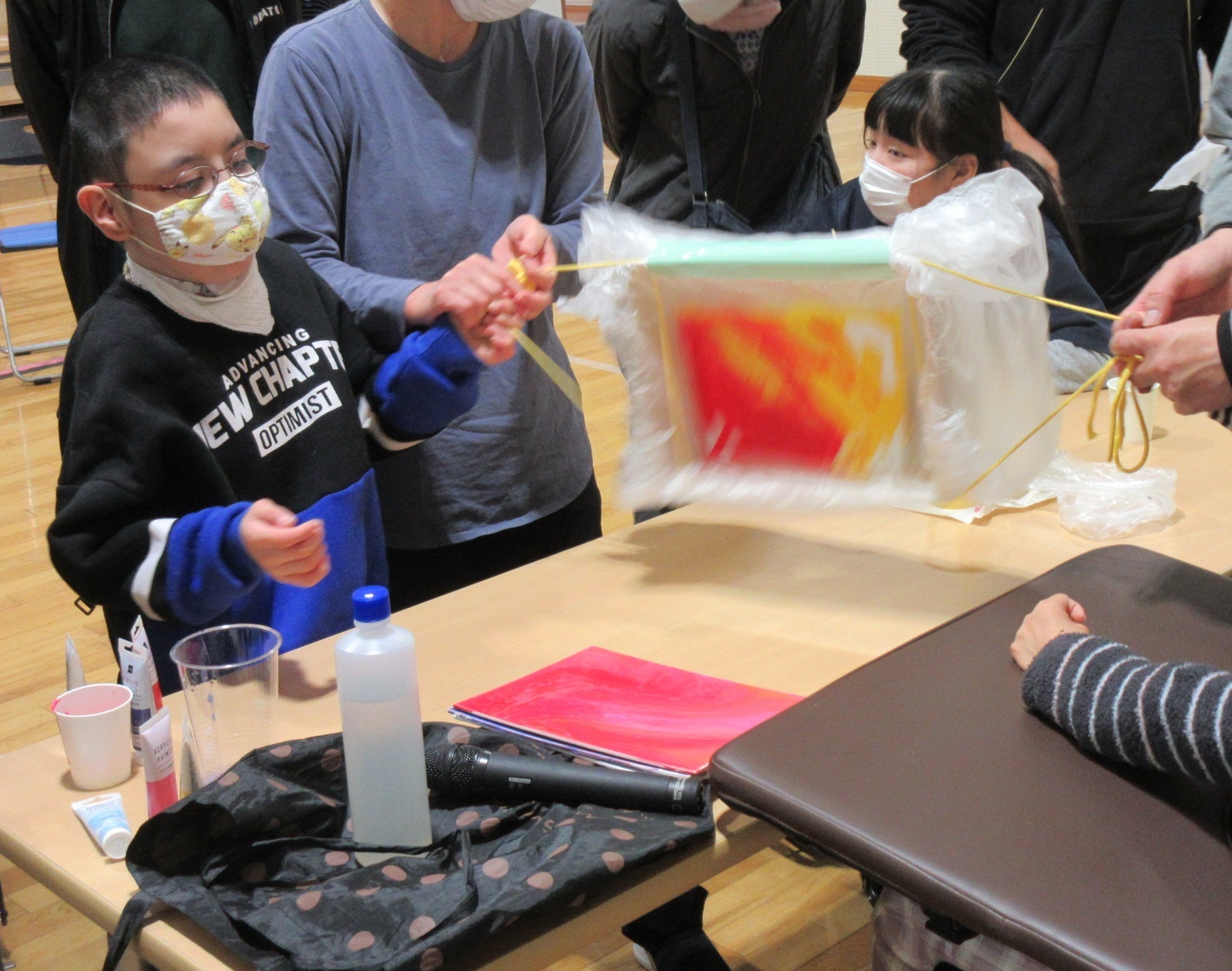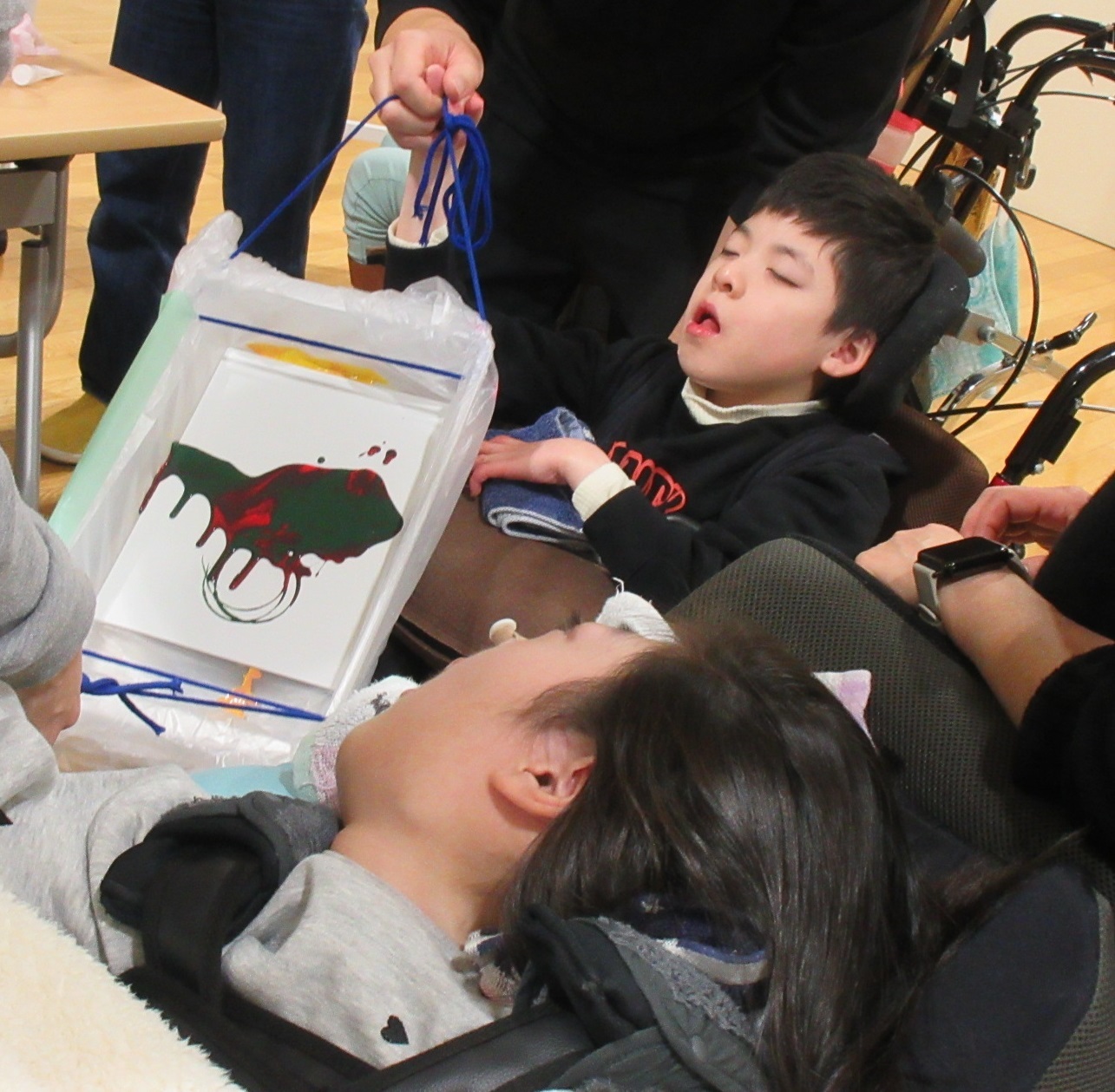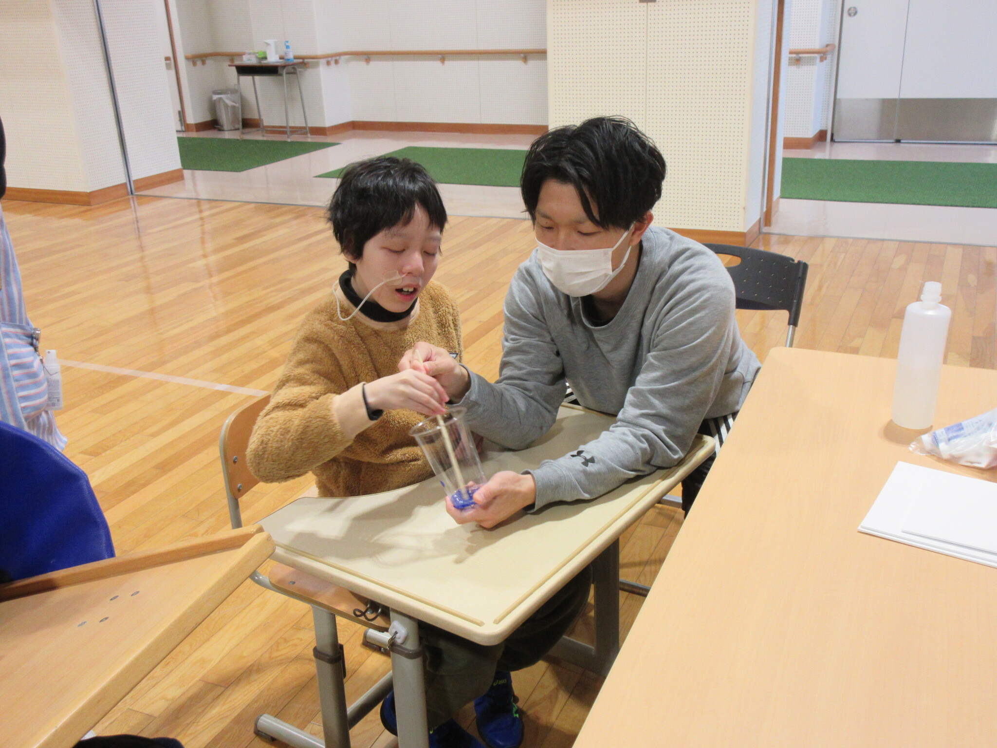 障害福祉サービス事業所ウェントス指扇さんの職員3名利用者4名が学校に来てくれました。施設の日課の紹介や施設広報を見せてもらった後にフルイドアートを体験しました。アクリルボードや段ボールの上にアクリル絵の具を垂らして揺らすことで流動的な模様を描きました。絵の具はコップの中で混ぜて好きな色やきらめきを作っていました。学校卒業後の生活に触れて、自分の進路を考える機会になりました。
