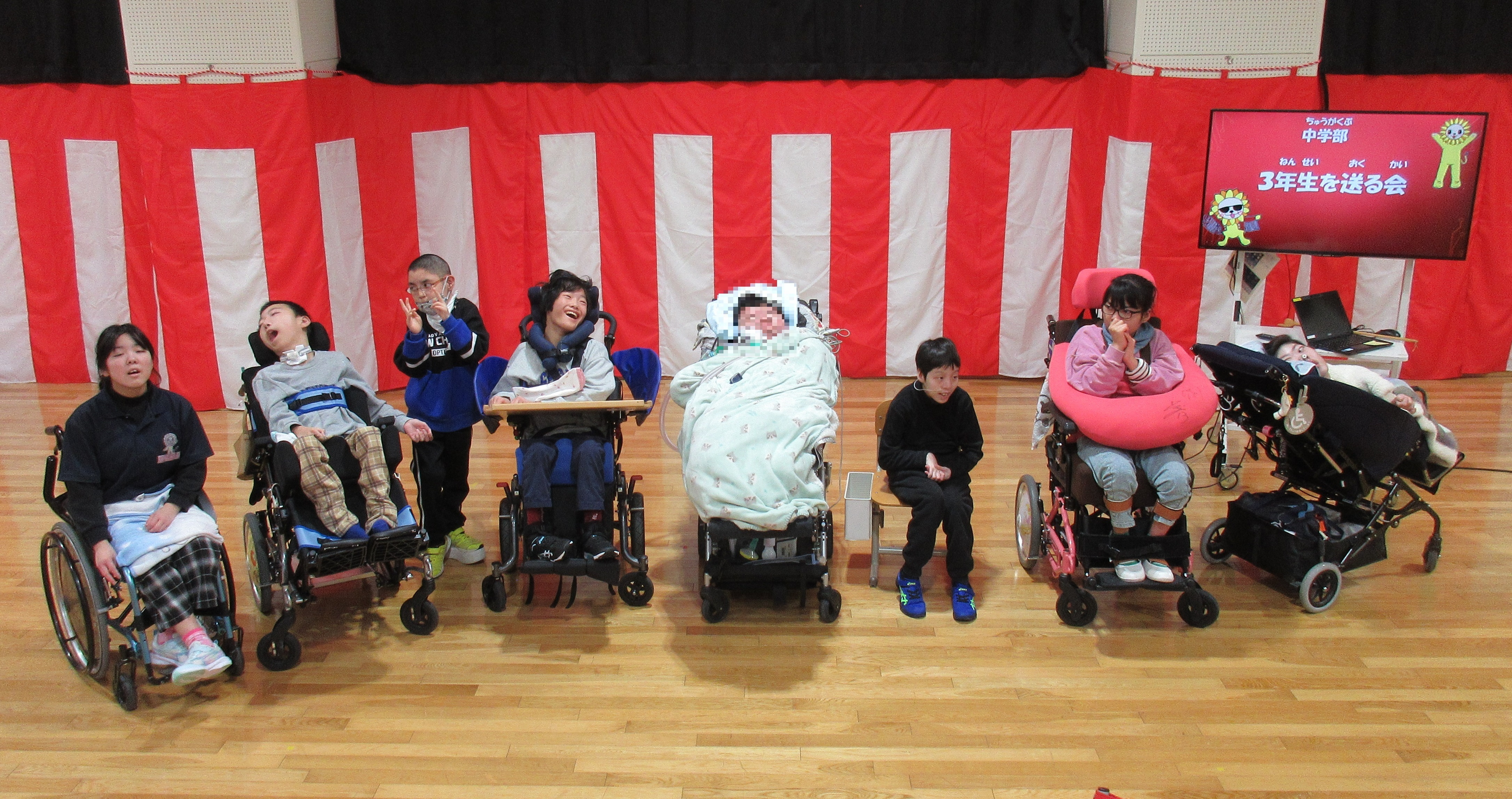 3月9日(月)に三送会を行いました。1年生から3年生までの写真で中学部生活を振り返りました。懐かしい人や楽しかった行事など様々なエピソードが出てきて盛り上がりました。写真で振り返った後は3年生に関わる〇×クイズをしました。3年生にヒントをもらったり、写真を思い出したりしながら楽しみました。最後に記念撮影して3年生の門出を祝いました。進路はそれぞれですが、新天地でも頑張ってください!
