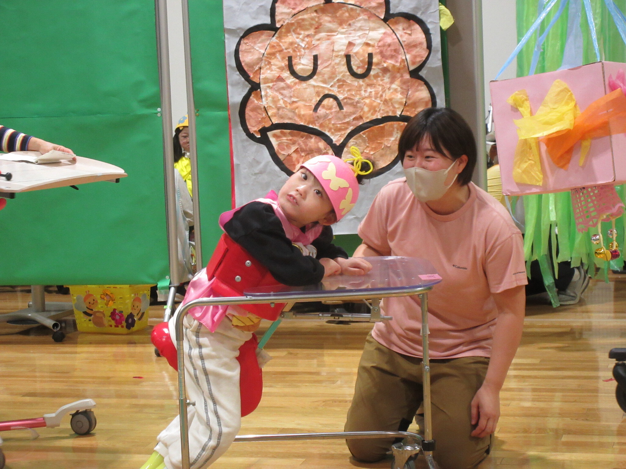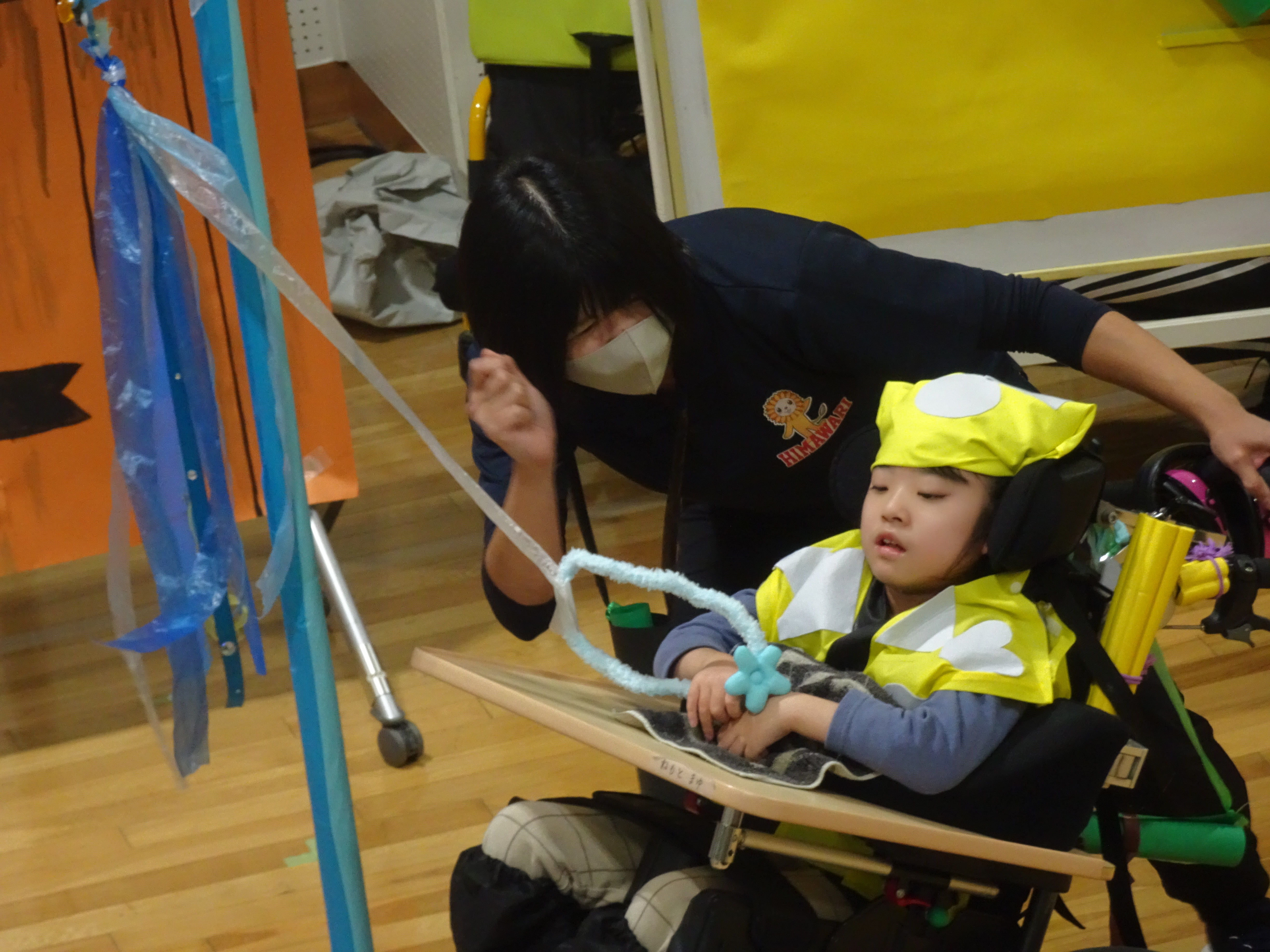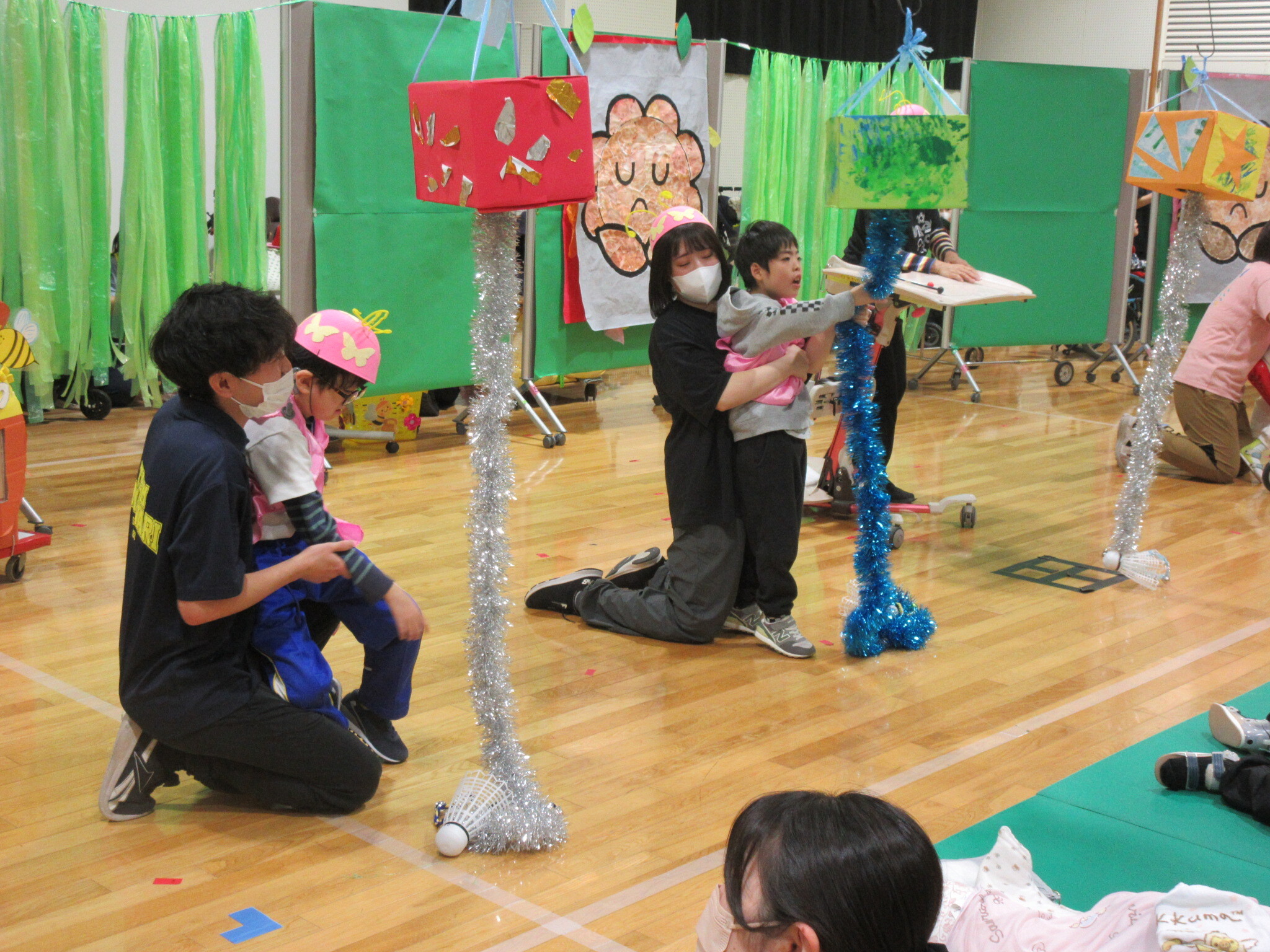 小学部低学年ブロックは、「かがやけ ひまわりっこ~一人ひとりのきんらきらぽん~」に取り組みました。それぞれ得意な方法で移動し、最後にきんらきらボール(くす玉)を割ってゴールすることができました。