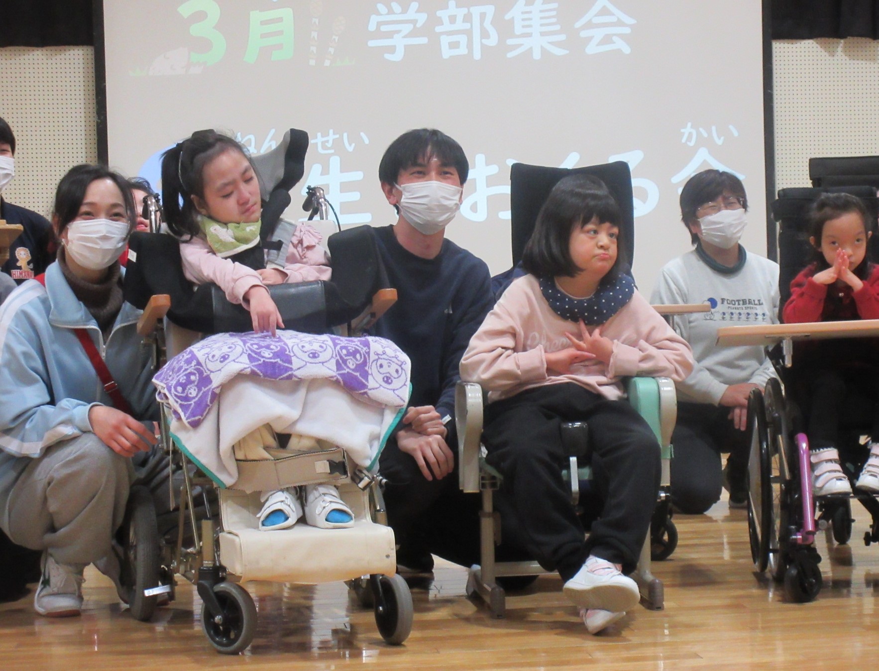 2月24日(火)の小学部集会では、6年生を送る会を行いました。1年生が担当として、6年生を迎えに行ったり、スイッチを押して進行したり、活動開始の合図をしたり、活動の見本を見せたりして、それぞれの役割をしっかり果たすことができました。